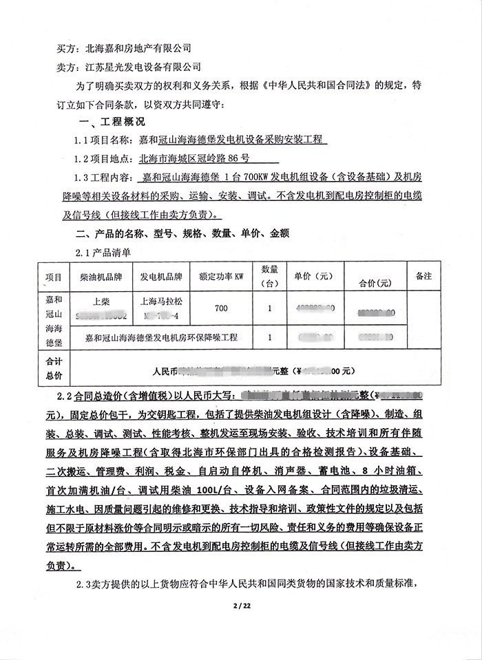 8月21日,我公司和北海嘉和房地產(chǎn)有限公司簽訂嘉和冠山海海德堡發(fā)電機(jī)設(shè)備采購(gòu)安裝工程合同。按照合同約定,我公司為其提供700KW上柴發(fā)電機(jī)組一臺(tái),配置為上柴柴油機(jī)配上海馬拉松發(fā)電機(jī),包含機(jī)房環(huán)保降噪工程設(shè)計(jì)、機(jī)組安裝、調(diào)試、驗(yàn)收、技術(shù)培訓(xùn)等服務(wù)。
