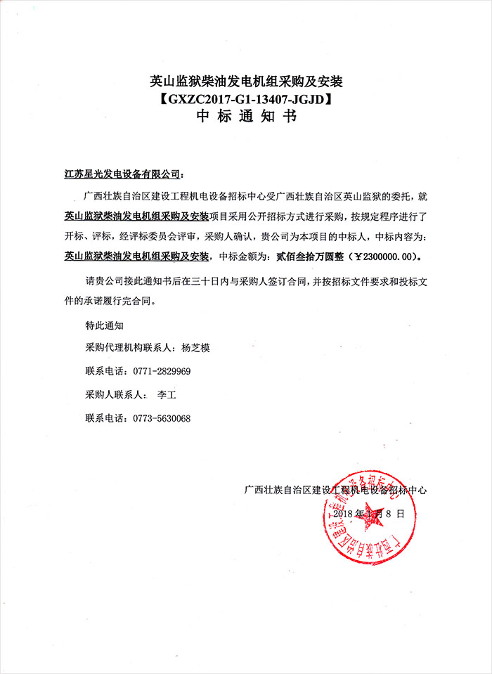 1月8日,我公司又傳來中標喜訊,此次中標的是廣西壯族自治區(qū)英山監(jiān)獄2臺1000KW玉柴柴油發(fā)電機組采購與安裝項目,中標金額達230萬元。據(jù)悉本次競標的公司一共17家,我公司憑借著雄厚的研發(fā)技術(shù)實力、專業(yè)的制造技術(shù)、完善的質(zhì)量管理體系,并且經(jīng)評標委員會各位專家的仔細評審,在眾多競爭對手中脫穎而出。
