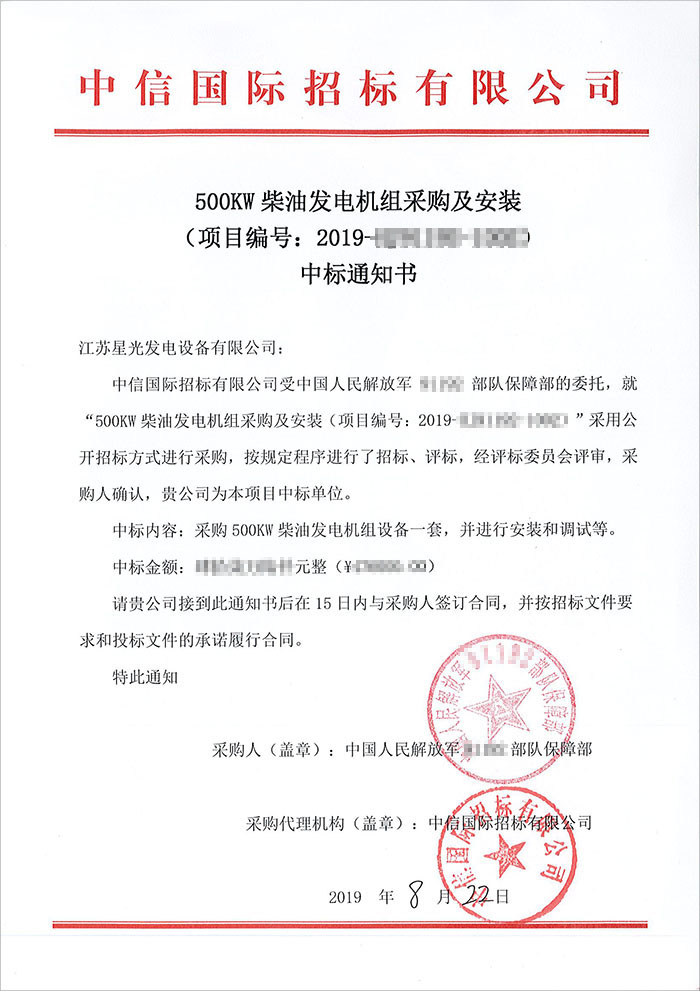 9月2日,我公司收到中信國際招標(biāo)有限公司傳來的中標(biāo)喜訊,被正式確認(rèn)為中國人民解放軍某部隊(duì)保障部500KW康明斯柴油發(fā)電機(jī)組的中標(biāo)人。