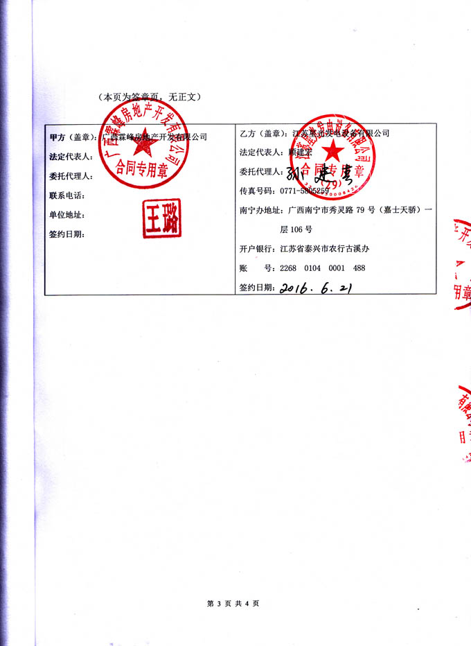 2016年6月21日 我公司與廣西霖峰房地產(chǎn)開發(fā)有限公司成功簽訂2#塊地小學(xué)122KW發(fā)電機(jī)房環(huán)保降噪安裝工程合同,我公司為其提供一臺里卡多柴油發(fā)電機(jī)組(機(jī)組配置為江蘇里卡多發(fā)動機(jī)配星光發(fā)電機(jī))的機(jī)房環(huán)保降噪除塵安裝工程的工作,我公司負(fù)責(zé)工程所需材料購買、安裝和油路連接,并保證工程達(dá)到環(huán)保驗(yàn)收標(biāo)準(zhǔn)要求。合同如下: