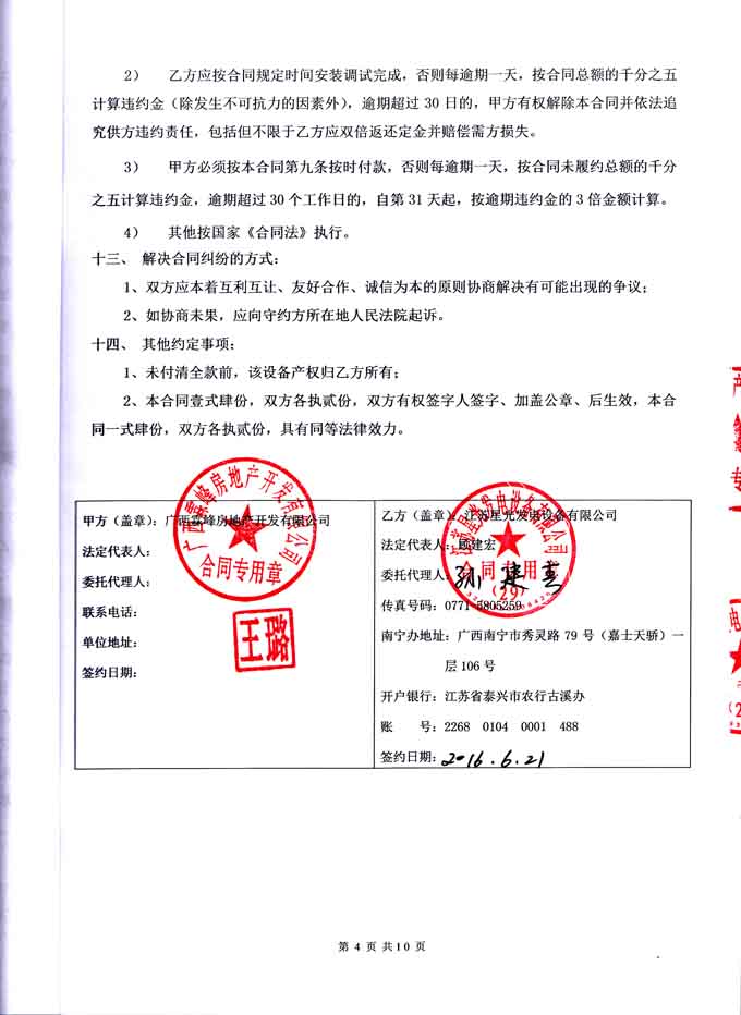 2016年6月21日,我江蘇星光發(fā)電設(shè)備有限公司成功與廣西霖峰房地產(chǎn)開發(fā)有限公司簽訂3#塊地11#樓660KW柴油發(fā)電機(jī)組購銷安裝合同,我公司為其提供一臺發(fā)電機(jī)組配置為為江蘇里卡多發(fā)動機(jī)配星光發(fā)電機(jī)和眾智控制器。發(fā)電機(jī)產(chǎn)品購銷合同如下: