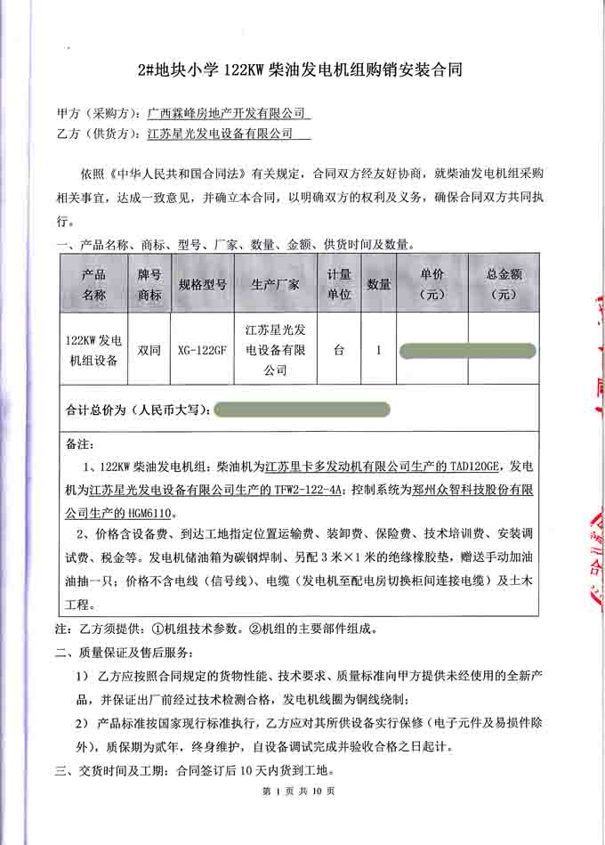 2016年6月21日,廣西霖峰房地產(chǎn)開發(fā)有限公司與我公司簽訂2#塊地小學 122KW柴油發(fā)電機組購銷安裝合同,我公司為其提供一臺里卡多柴油發(fā)電機組一臺,機組配置為江蘇里卡多發(fā)動機配星光發(fā)電機及鄭州眾智控制器。發(fā)電機產(chǎn)品購銷合同如下: