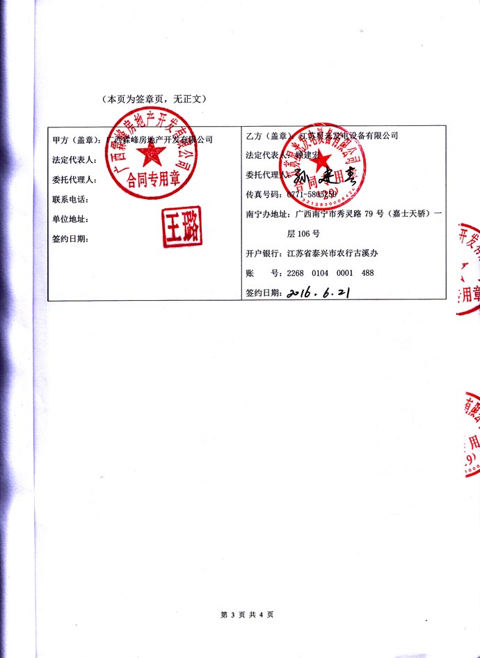 2016年6月21日 廣西霖峰房地產(chǎn)開發(fā)有限公司與我公司簽訂3#塊地9#樓 800KW發(fā)電機(jī)組 發(fā)電機(jī)房環(huán)保降噪安裝工程合同,我公司為其提供一臺(tái)里卡多柴油發(fā)電機(jī)組的發(fā)電機(jī)房環(huán)保降噪除塵安裝工程的工作,負(fù)載工程所需材料購買、安裝和油路連接,并保證工程達(dá)到環(huán)保驗(yàn)收標(biāo)準(zhǔn)要求。合同如下:
