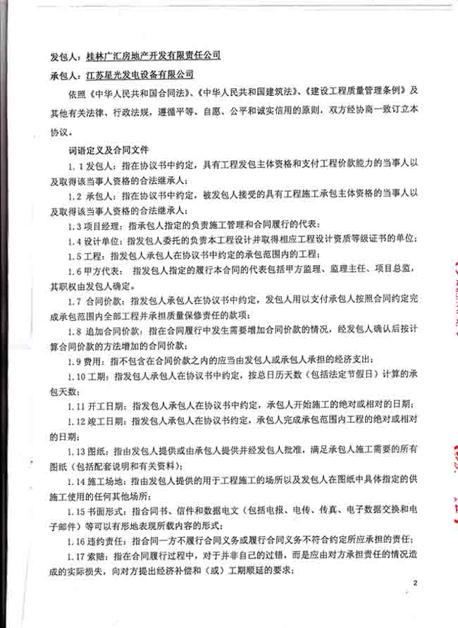 2016年6月8日,桂林廣匯房地產(chǎn)開發(fā)有限責(zé)任公司與我公司簽訂清華園一期發(fā)電機(jī)采購(gòu)及安裝工程合同,我公司為其提供一臺(tái)常用功率450KW柴油發(fā)電機(jī)組和機(jī)組配備的電瓶、油箱、輸油管、排煙管等設(shè)備,以及機(jī)組的運(yùn)輸安裝調(diào)試工作。機(jī)組配置選用的品牌為重慶康明斯柴油機(jī);上??破?/span>發(fā)電機(jī);鄭州眾智控制器。發(fā)電機(jī)產(chǎn)品購(gòu)銷合同如下:
