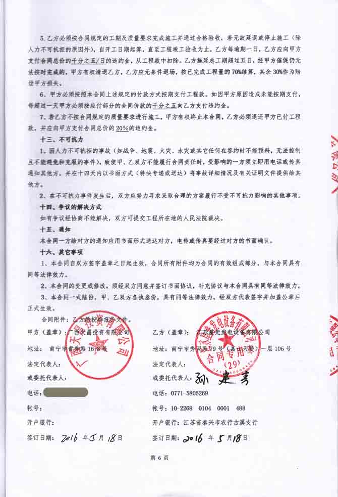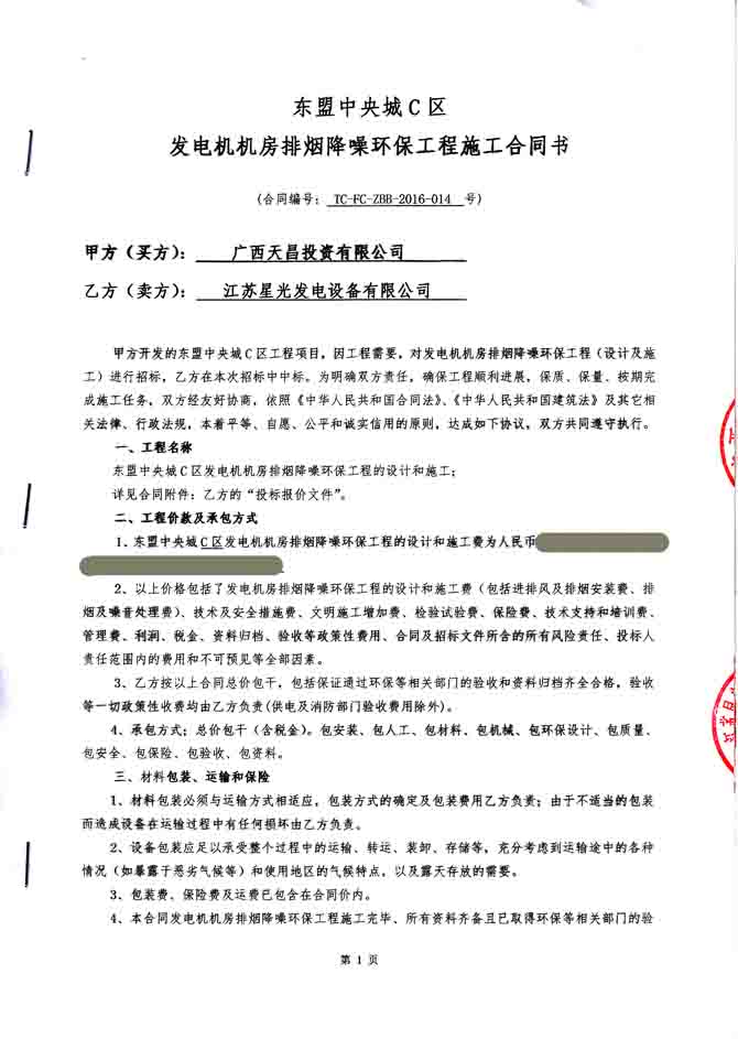 2016年5月18日,廣西天昌投資有限公司與我公司簽訂?wèn)|盟中央城C區(qū)發(fā)電機(jī)機(jī)房排煙降噪環(huán)保工程施工合同,我公司為其提供一臺(tái)630KW康明斯發(fā)電機(jī)組的機(jī)房噪聲、廢氣綜合治理、環(huán)保工程及機(jī)房照明、排風(fēng)工程的設(shè)計(jì)及施工。合同如下: