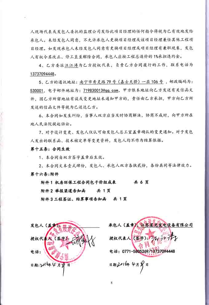 2016年4月29日,我公司與南寧銀象房地產(chǎn)開發(fā)有限責任公司簽訂南寧恒大綠洲首期、二期8#、23#、37#地下室柴油發(fā)電機機房環(huán)保工程合同,我公司分別為其提供400KW發(fā)電機組、640KW柴油發(fā)電機組和800KW柴油發(fā)電機組的機房噪聲、廢氣綜合治理、環(huán)保工程及機房照明、排風工程。合同如下: