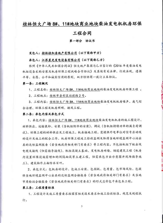 2016年4月29日,林桂加房地產(chǎn)有限公司與我公司簽訂了桂林恒大廣場8#、11#地塊商業(yè)地塊柴油發(fā)電機機房環(huán)保工程合同,我公司為其提供1000KW柴油發(fā)電機組和1200KW柴油發(fā)電機組的機房噪聲、廢氣綜合治理、環(huán)保工程及機房照明、排風(fēng)工程。合同如下: