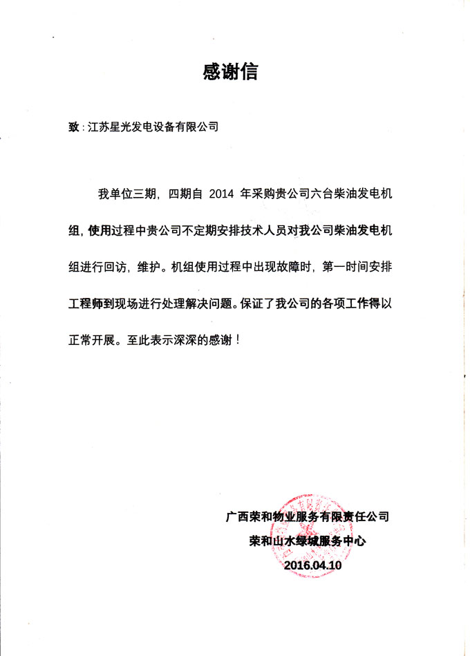 2016年4月10日,收到廣西榮和物業(yè)服務(wù)有限責(zé)任公司致我公司感謝信,其對我公司售后服務(wù)技術(shù)人員服務(wù)反應(yīng)迅速,上門維修保養(yǎng)柴油發(fā)電機(jī)組服務(wù)到位,認(rèn)真的售后服務(wù)工作表示感謝!