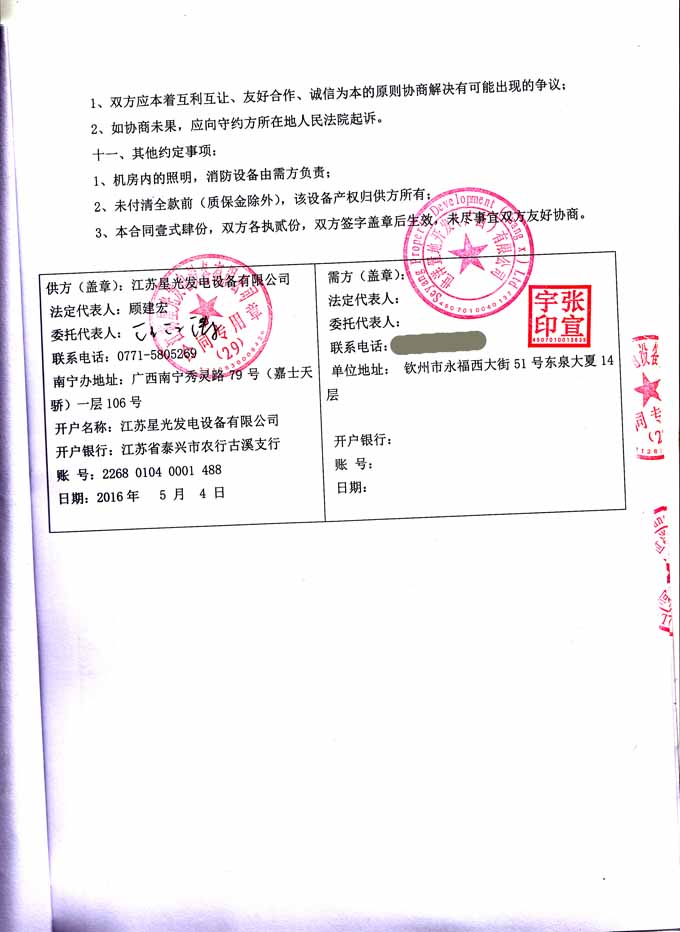 2016年5月4日,我公司成功與世洋置地開發(fā)(廣西)有限公司簽訂800KW柴油發(fā)電機組產(chǎn)品購銷合同,我公司為其提供配置為柴油機:江蘇里卡多發(fā)動機生產(chǎn)的TAD800GE;發(fā)電機:江蘇星光發(fā)電設(shè)備有限公司機生產(chǎn)的TFW2-800-4A的里卡多柴油發(fā)電機組一臺。發(fā)電機產(chǎn)品購銷合同如下: