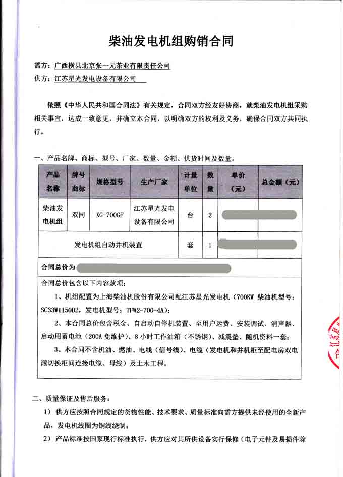 2016年4月26日,廣西橫縣北京張一元茶業(yè)有限責(zé)任公司與我公司簽訂柴油發(fā)電機(jī)組購銷合同,我公司為其提供兩臺(tái)700KW發(fā)電機(jī)組和發(fā)電機(jī)組自動(dòng)并機(jī)裝置一套,機(jī)組配置為上海柴油機(jī)股份有限公司配江蘇星光發(fā)電機(jī)(700KW柴油機(jī)型號(hào):SC33W1150D2,發(fā)電機(jī)型號(hào):TFfF2-700-4A)。發(fā)電機(jī)產(chǎn)品購銷合同如下: