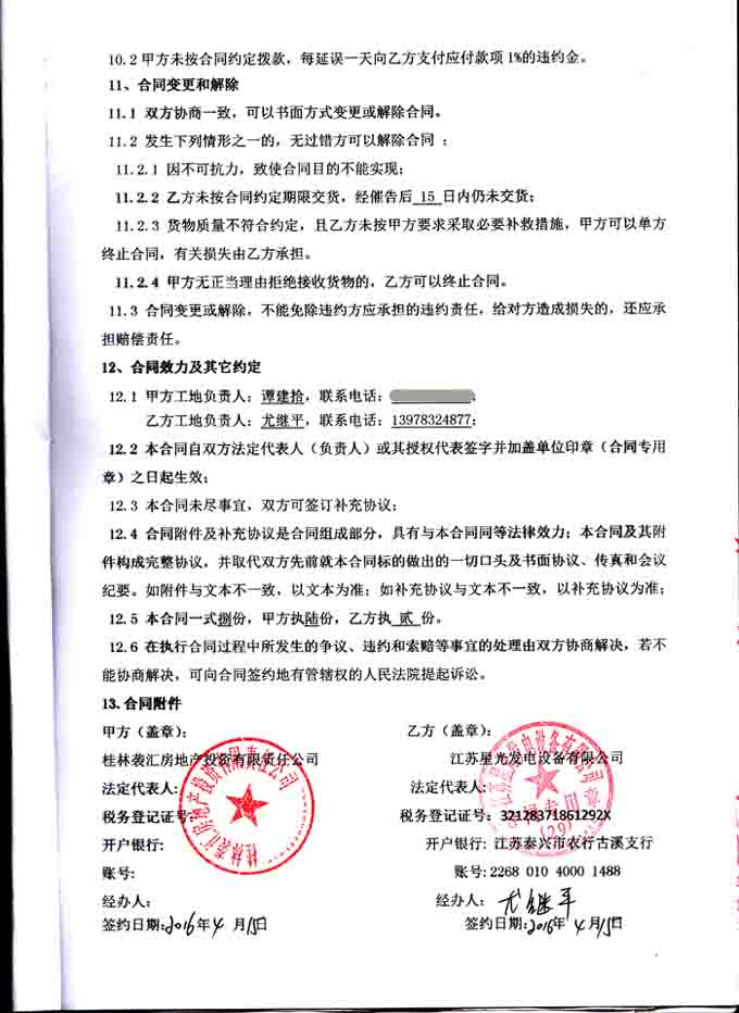 2016年4月15日,桂林襲匯房地產(chǎn)投資有限責(zé)任公司與我公司簽訂滟瀾山B組團(tuán)柴油發(fā)電機組采購安裝合同,我公司為其提供一臺250KW康明斯發(fā)電機組,機組為重慶康明斯柴油機配上海科浦發(fā)電機,配有消音器蓄電池等部件。發(fā)電機產(chǎn)品購銷合同如下:
