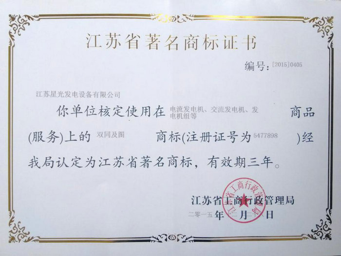日前,我公司商標品牌建設(shè)再傳捷報,我公司在核定使用在電流發(fā)電機、交流發(fā)電機、發(fā)電機組等商品(服務(wù))上的雙同及圖商標經(jīng)江蘇省工商行政管理局認定為江蘇省著名商標。