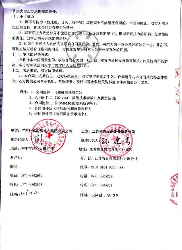 2016年4月20日,廣西桂嘉匯房地產(chǎn)集團(tuán)有限公司與我公司簽訂800KW柴油發(fā)電機(jī)組采購合同,我公司為其提供一臺配置為康明斯發(fā)動機(jī)配上海馬拉松發(fā)電機(jī)合鄭州眾智控制器的發(fā)電機(jī)組,發(fā)電機(jī)產(chǎn)品購銷合同如下:
