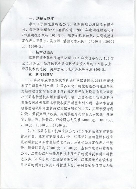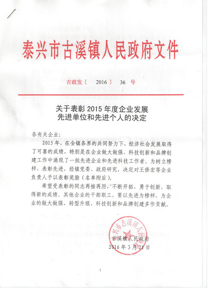 我公司在2016年3月21日的泰興市古溪鎮(zhèn)人民政府文件《關(guān)于表彰2015年度企業(yè)發(fā)展先進(jìn)單位和先進(jìn)個(gè)人的決定》中獲得以下表彰: