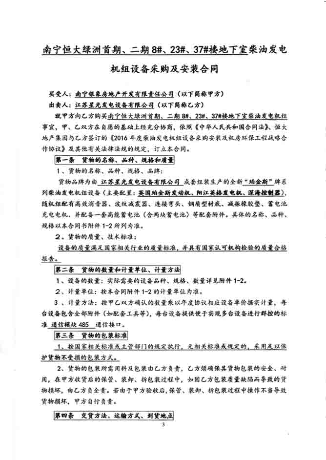 2016年4月5日,南寧銀象房地產(chǎn)開發(fā)有限責(zé)任公司與我公司簽訂南寧恒大綠洲首期、二期8#、23#、37#樓地下室柴油發(fā)電機(jī)組設(shè)備采購及安裝合同,我公司為其提供配置為英國珀金斯發(fā)動(dòng)機(jī)、陽江英格發(fā)電機(jī)深??刂破鞯?00KW發(fā)電機(jī)組、640KW發(fā)電機(jī)組、800KW發(fā)電機(jī)組各一臺,機(jī)組配有高效消音器、波紋減震器及蓄電池等附件。發(fā)電機(jī)產(chǎn)品購銷合同如下: