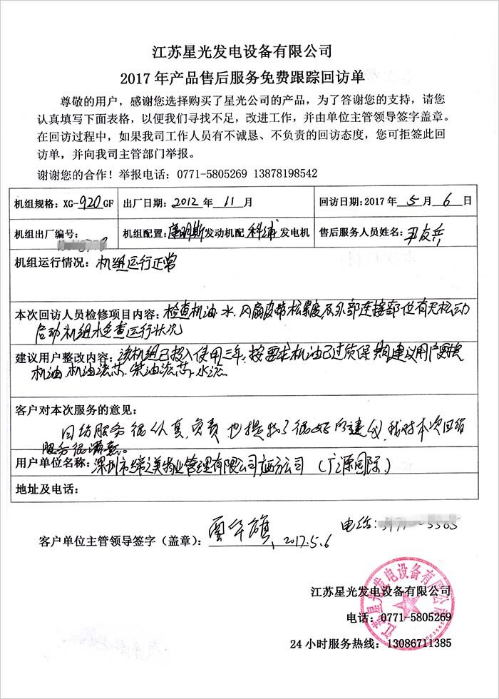 5月6日,我公司售后技術(shù)員尹師傅到深圳市締之美物業(yè)管理公司廣西分公司(廣源國際)進行免費售后跟蹤回訪。其于2012年11月在我司購買920KW康明斯發(fā)電機組一臺,配置為康明斯發(fā)動機配科浦發(fā)電機,距今使用時間5年多。尹師傅通過現(xiàn)場檢查機油、水、風(fēng)扇皮帶松緊度及外部連接部位有無松動并啟動機組檢查運行狀況等,發(fā)現(xiàn)該康明斯發(fā)電機組由于使用時間過長,其機油已過質(zhì)保期,而且濾芯已出現(xiàn)耗損,尹師傅建議用戶更換機油,機油濾芯,柴油濾芯等,以確保發(fā)電機組正常運行。