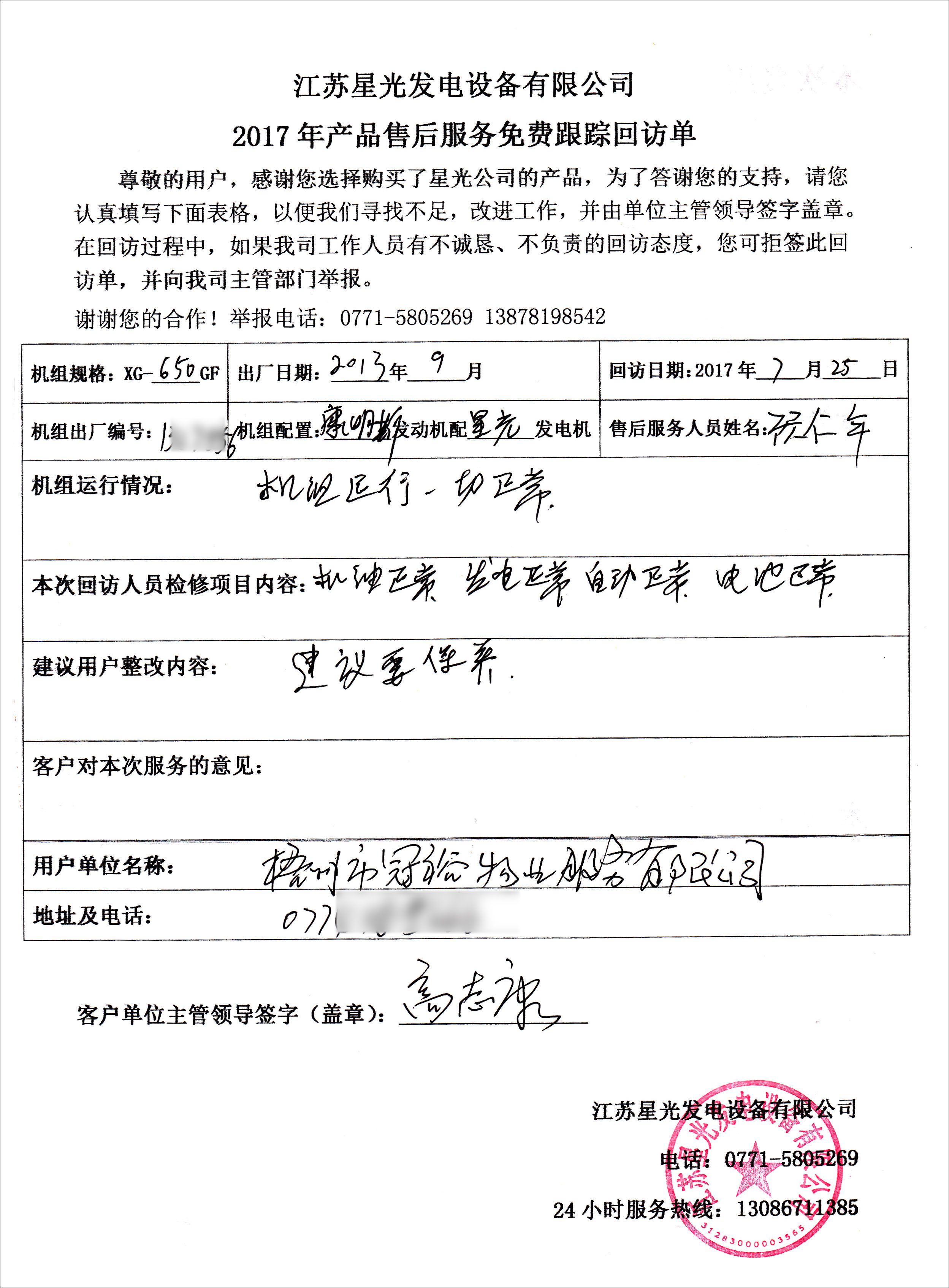7月25日,我公司售后技術(shù)員顧師傅到梧州冠裕物業(yè)公司對(duì)其于2013年9月在我司購買的兩臺(tái)康明斯發(fā)電機(jī)組進(jìn)行免費(fèi)售后回訪服務(wù)。顧師傅檢查了機(jī)油、電池及機(jī)組自動(dòng)化、發(fā)電情況均正常。因機(jī)組已使用較長時(shí)間,顧師傅建議對(duì)機(jī)組進(jìn)行保養(yǎng),以確保機(jī)組正常運(yùn)行。更多關(guān)于康明斯發(fā)電機(jī)組售后服務(wù)歡迎撥打星光熱線:13878198542