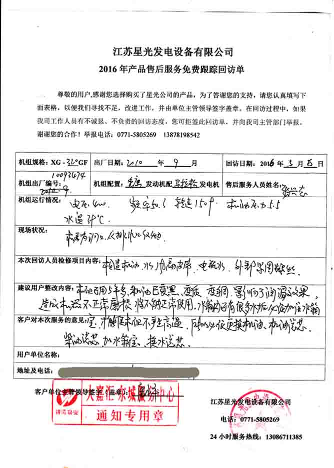 2016年5月6日,我公司技術(shù)人員到大嘉匯東城服務中心進行發(fā)電機組免費回訪。本次回訪的機組是2010年我公司為其提供的重慶康明斯柴油機配馬拉松發(fā)電機的320KW發(fā)電機組。技術(shù)人員啟動機組檢查機油、水箱水、風葉皮帶、電瓶水、外部堅固螺絲等部件,并針對機組目前的運行狀況給出建議。下面是本次回訪記錄: