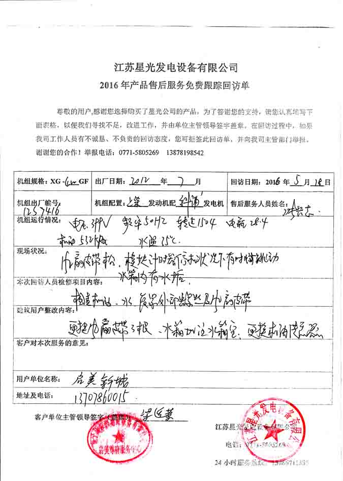 2016年5月18日,我江蘇星光動(dòng)力集團(tuán)售后人員到南寧市溫馨園物業(yè)服務(wù)有限公司的金象綠城一區(qū)及啟美新城發(fā)電機(jī)房,對(duì)其向我公司購買的300KW柴油發(fā)電機(jī)組和400KW發(fā)電機(jī)兩臺(tái)上柴發(fā)電機(jī)組進(jìn)行免費(fèi)回訪。