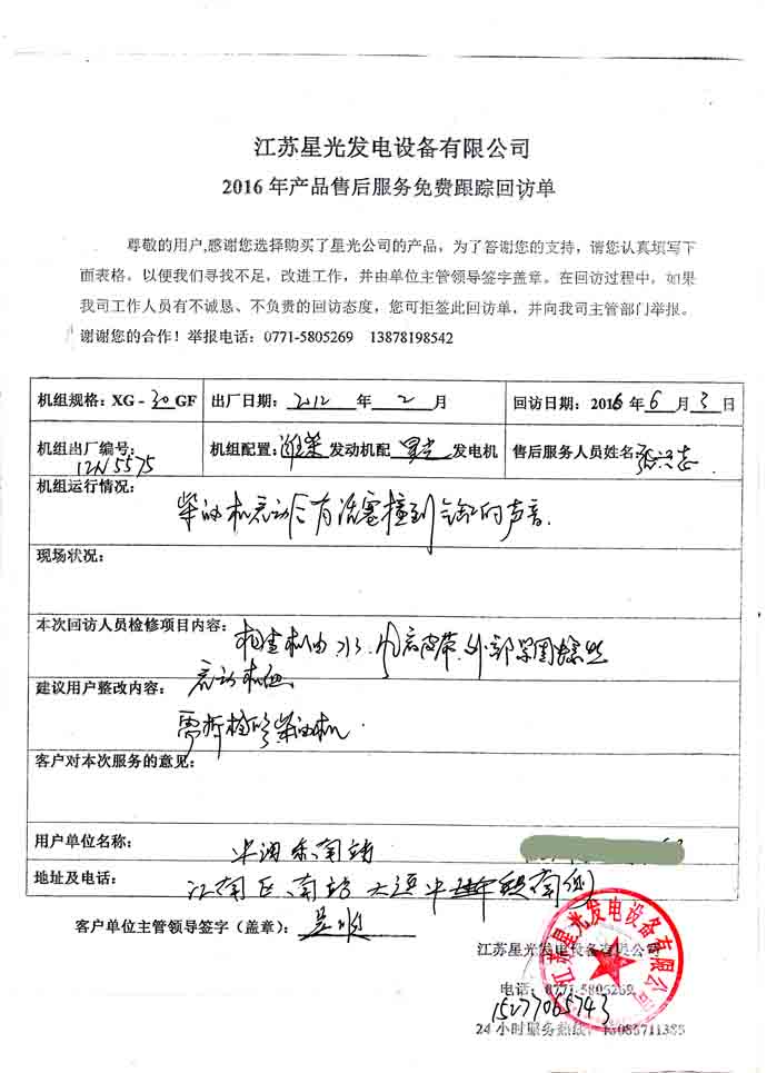 2016年6月3日,我江蘇星光公司售后服務(wù)部技術(shù)人員到中國石油東南加油站,對(duì)其向我公司購買的30KW柴油發(fā)電機(jī)組(機(jī)組配置為濰柴發(fā)動(dòng)機(jī)配星光發(fā)電機(jī))進(jìn)行免費(fèi)回訪。本次回訪技術(shù)人員檢查了機(jī)組的機(jī)油、水箱水、風(fēng)扇皮帶機(jī)外部緊固螺絲等部件,并啟動(dòng)機(jī)組,發(fā)現(xiàn)柴油機(jī)需要進(jìn)行維修。下面是本次回訪記錄: