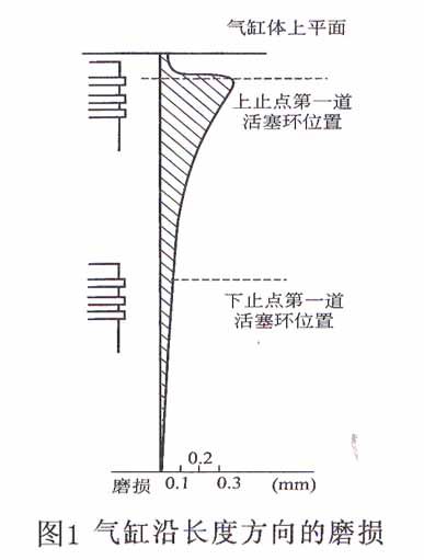 1、沿長(zhǎng)度方向成“錐形”,圖1是氣缸沿長(zhǎng)度方向磨損示意圖,圖中的陰影部分表示磨損量,由圖可知:在活塞環(huán)運(yùn)動(dòng)區(qū)域內(nèi)磨損較大;這種磨損是不均勻的,上重下輕,使氣缸沿長(zhǎng)度方向成“錐形”;其最大磨損發(fā)生在活塞處于上止點(diǎn)時(shí),與第一道活塞環(huán)相對(duì)的氣缸壁稍下處;最小的磨損發(fā)生在氣缸的最下部,即活塞行程以外的氣缸壁。