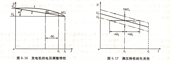 在一般情況下,調(diào)壓特性是一條U=f(I)的曲線。I為發(fā)電機(jī)的無功電流,如圖9.16中的曲線。在圖9.16中,Ie為發(fā)電機(jī)的額定無功電流,U0及Ue分別為發(fā)電機(jī)空載時及額定無功負(fù)載的電壓。為了方便起見,通常用一條直線(圖中的曲線2)近似地取代曲線1,并用以下參數(shù)表征調(diào)壓特性。