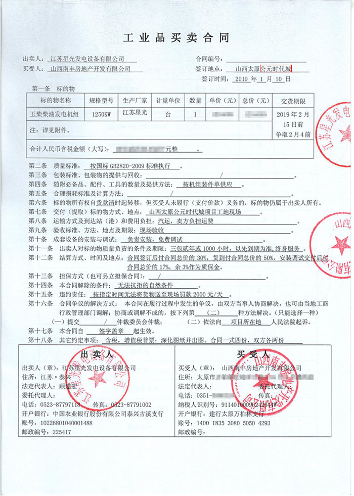 1月10日,我公司和山西南豐房地產(chǎn)開(kāi)發(fā)有限公司成功簽訂一臺(tái)1250KW玉柴柴油發(fā)電機(jī)組,該機(jī)組用于山西太原公元時(shí)代城應(yīng)急備用電源。