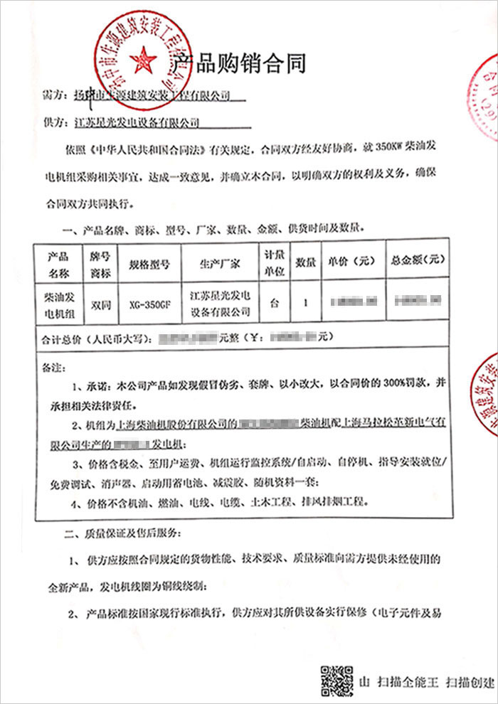 恭喜我公司和揚中市生源建筑安裝公司第二次合作,成功簽訂一臺350KW上柴發(fā)電機