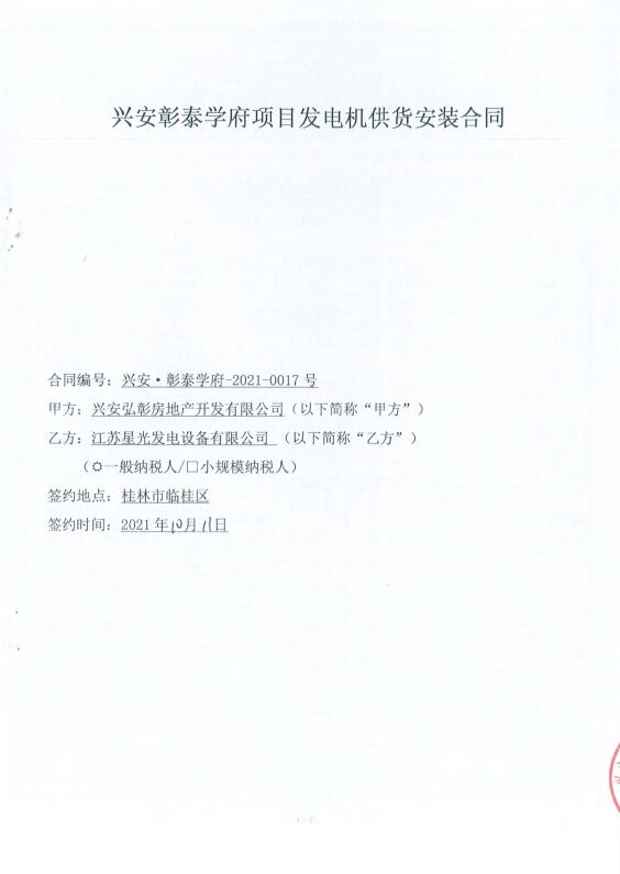 星光公司作為彰泰集團多年的柴油發(fā)電機組戰(zhàn)略采購及安裝戰(zhàn)略供應商,和彰泰集團保持著友好合作關系。江蘇星光發(fā)電設備有限公司與彰泰集團的興安弘彰房地產開發(fā)有限公司簽訂600KW柴油發(fā)電機組協(xié)議。該機組用于興安彰泰學府項目備用電源。