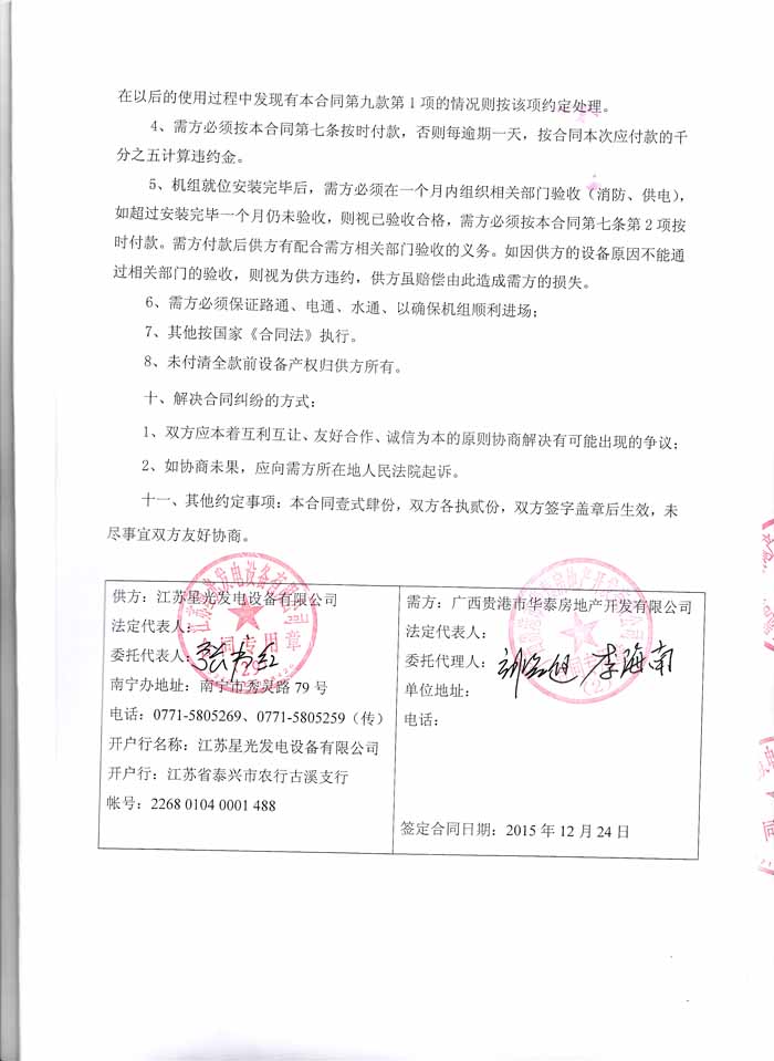 2015年12月24日,廣西貴港市華泰房地產(chǎn)開(kāi)發(fā)有限公司與我公司簽訂了柴油發(fā)電機(jī)組產(chǎn)品購(gòu)銷合同,我公司為其提供了550KW上柴柴油發(fā)電機(jī)組一臺(tái)。發(fā)電機(jī)產(chǎn)品購(gòu)銷合同如下: