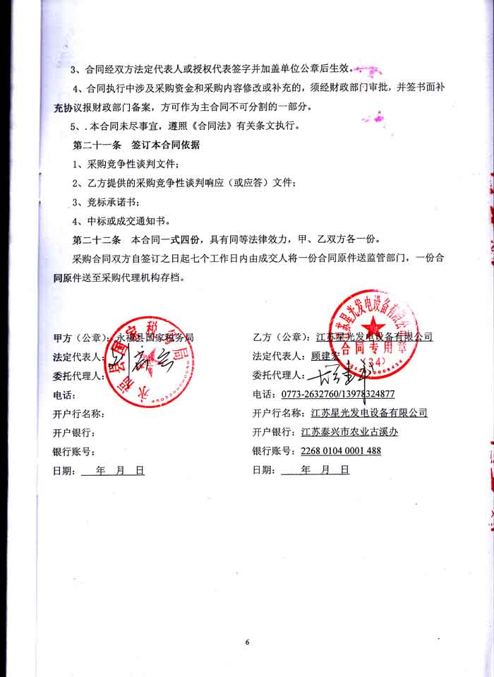 2015年12月28日,廣西永??h國家稅務局與我公司簽訂了150KW發(fā)電機組購銷合同,我公司為其提供里卡多柴油發(fā)電機配星光發(fā)電機的柴油發(fā)電機組一臺。江蘇星光動力集團自成立以來就以技術創(chuàng)新為己任,設計生產的柴油發(fā)電機組一直在同行業(yè)中遙遙領先,得到各種外界人士的認可。發(fā)電機產品購銷合同如下: