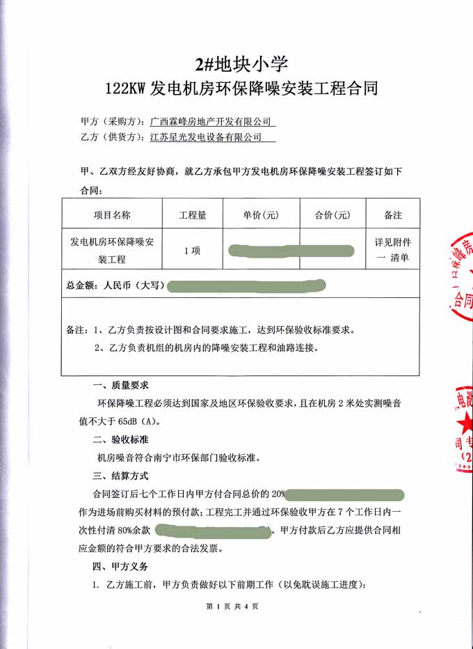 2016年6月21日 我公司與廣西霖峰房地產(chǎn)開發(fā)有限公司成功簽訂2#塊地小學(xué)122KW發(fā)電機(jī)房環(huán)保降噪安裝工程合同,我公司為其提供一臺里卡多柴油發(fā)電機(jī)組(機(jī)組配置為江蘇里卡多發(fā)動機(jī)配星光發(fā)電機(jī))的機(jī)房環(huán)保降噪除塵安裝工程的工作,我公司負(fù)責(zé)工程所需材料購買、安裝和油路連接,并保證工程達(dá)到環(huán)保驗(yàn)收標(biāo)準(zhǔn)要求。合同如下:
