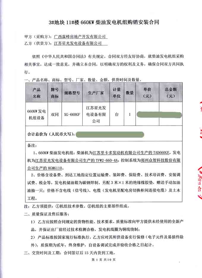 2016年6月21日,我江蘇星光發(fā)電設(shè)備有限公司成功與廣西霖峰房地產(chǎn)開發(fā)有限公司簽訂3#塊地11#樓660KW柴油發(fā)電機(jī)組購銷安裝合同,我公司為其提供一臺發(fā)電機(jī)組配置為為江蘇里卡多發(fā)動機(jī)配星光發(fā)電機(jī)和眾智控制器。發(fā)電機(jī)產(chǎn)品購銷合同如下: