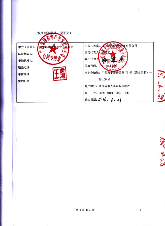 2016年6月21日 我江蘇星光發(fā)電設(shè)備有限公司成功與廣西霖峰房地產(chǎn)開發(fā)有限公司簽訂2#塊地5#樓800KW發(fā)電機(jī)房環(huán)保降噪安裝工程合同,我公司為其提供機(jī)組的機(jī)房環(huán)保降噪除塵安裝工程額油路的連接工作,負(fù)責(zé)按設(shè)計(jì)圖和施工要求采購工程所需材料進(jìn)行施工,并保證工程達(dá)到環(huán)保驗(yàn)收標(biāo)準(zhǔn)要求。合同如下:
