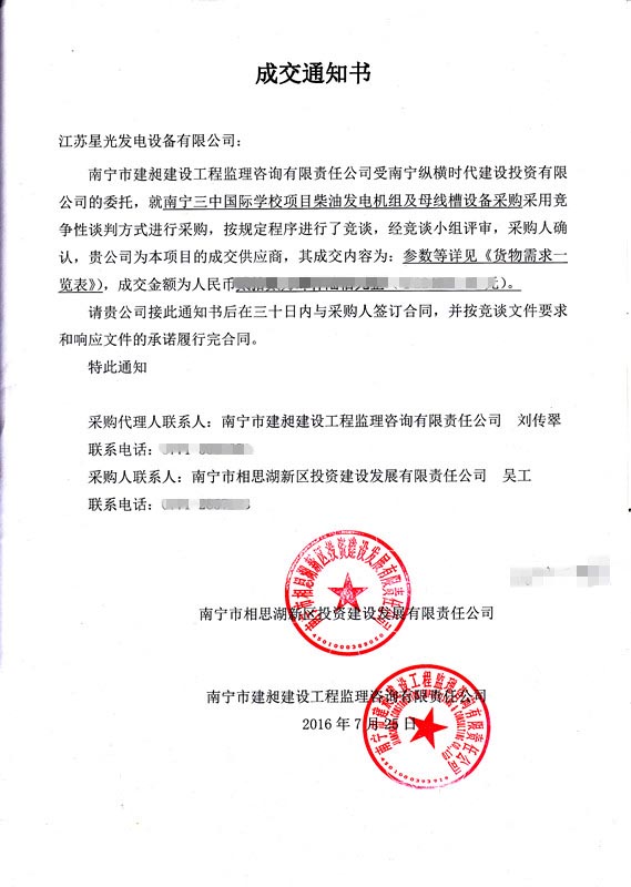 2016年7月25日,南寧市建昶建設工程監(jiān)理咨詢有限責任公司受南寧縱橫時代建設投資有限公司的委托,就南寧三中國際學校項目柴油發(fā)電機組及母線槽設備采購采用競爭談判方式進行采購,按規(guī)定程序進行競談,經(jīng)競談小組評審,采購人確認,江蘇星光發(fā)電設備有限公司為本項目的成交供應商。以下是采購成交通知書: