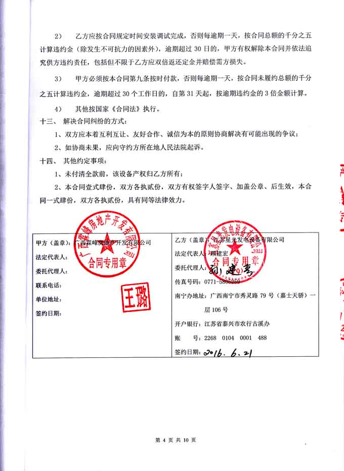 2016年6月21日,廣西霖峰房地產(chǎn)開發(fā)有限公司與我公司簽訂2#塊地小學 122KW柴油發(fā)電機組購銷安裝合同,我公司為其提供一臺里卡多柴油發(fā)電機組一臺,機組配置為江蘇里卡多發(fā)動機配星光發(fā)電機及鄭州眾智控制器。發(fā)電機產(chǎn)品購銷合同如下: