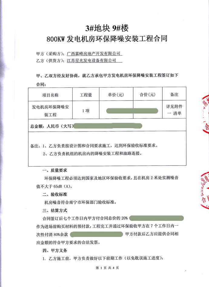 2016年6月21日 廣西霖峰房地產(chǎn)開發(fā)有限公司與我公司簽訂3#塊地9#樓 800KW發(fā)電機(jī)組 發(fā)電機(jī)房環(huán)保降噪安裝工程合同,我公司為其提供一臺(tái)里卡多柴油發(fā)電機(jī)組的發(fā)電機(jī)房環(huán)保降噪除塵安裝工程的工作,負(fù)載工程所需材料購買、安裝和油路連接,并保證工程達(dá)到環(huán)保驗(yàn)收標(biāo)準(zhǔn)要求。合同如下: