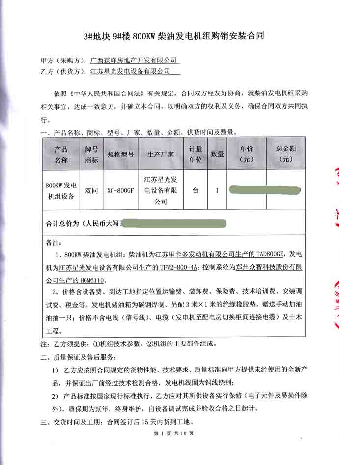 2016年6月21日,廣西霖峰房地產(chǎn)開(kāi)發(fā)有限公司與我公司簽訂3#塊地 9#樓柴油發(fā)電機(jī)組購(gòu)銷(xiāo)安裝合同,我公司為其提供一臺(tái)800KW發(fā)電機(jī)組,機(jī)組配置為江蘇里卡多發(fā)動(dòng)機(jī)配星光發(fā)電機(jī)。發(fā)電機(jī)產(chǎn)品購(gòu)銷(xiāo)合同如下: