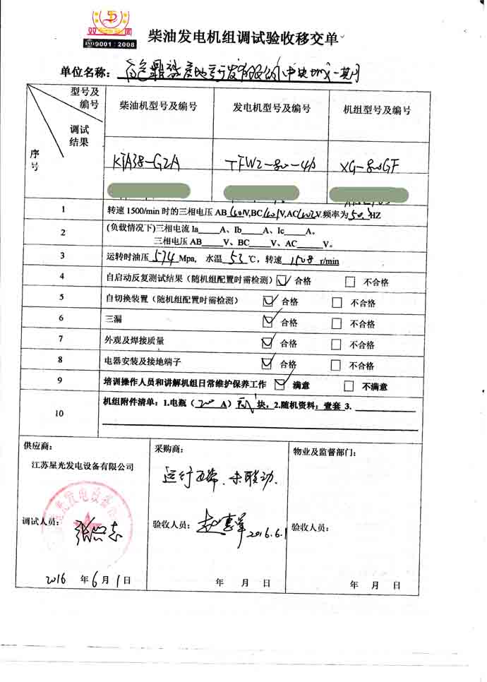 2016年6月1日,我公司技術(shù)服務(wù)人員到中央城一期的發(fā)電機(jī)組安裝現(xiàn)場(chǎng),對(duì)百色鼎盛房地產(chǎn)開發(fā)有限公司向我公司購(gòu)買的800KW康明斯柴油發(fā)電機(jī)組進(jìn)行調(diào)試交付工作,并培訓(xùn)操作人員和講解機(jī)組日常維護(hù)保養(yǎng)工作。以下是發(fā)電機(jī)組調(diào)試驗(yàn)收單: