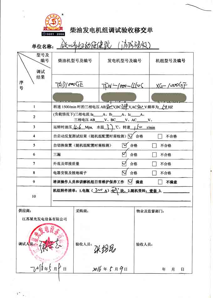 2016年5月9日,我江蘇星光動(dòng)力集團(tuán)技術(shù)人員到欽州市婦幼保健院的發(fā)電機(jī)組安裝現(xiàn)場(chǎng),對(duì)我公司提供的兩臺(tái)1000KW柴油發(fā)電機(jī)組進(jìn)行調(diào)試交付工作,并為用戶培訓(xùn)操作人員和講解機(jī)組日常維護(hù)保養(yǎng)工作。以下是發(fā)電機(jī)組調(diào)試驗(yàn)收單: