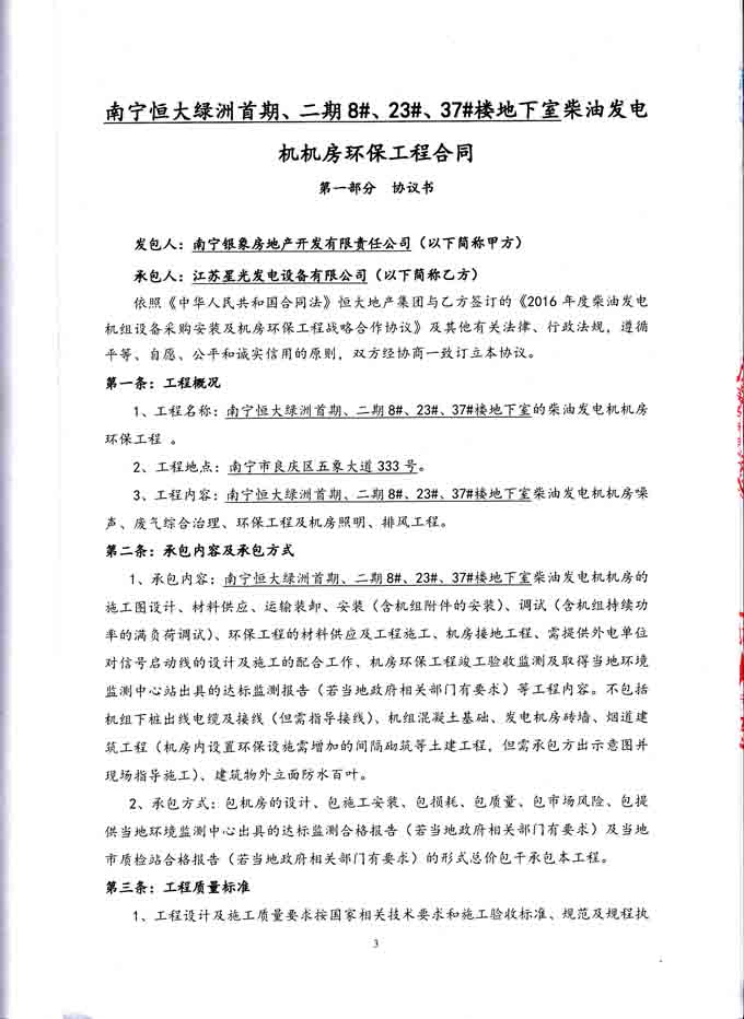 2016年4月29日,我公司與南寧銀象房地產(chǎn)開發(fā)有限責任公司簽訂南寧恒大綠洲首期、二期8#、23#、37#地下室柴油發(fā)電機機房環(huán)保工程合同,我公司分別為其提供400KW發(fā)電機組、640KW柴油發(fā)電機組和800KW柴油發(fā)電機組的機房噪聲、廢氣綜合治理、環(huán)保工程及機房照明、排風工程。合同如下: