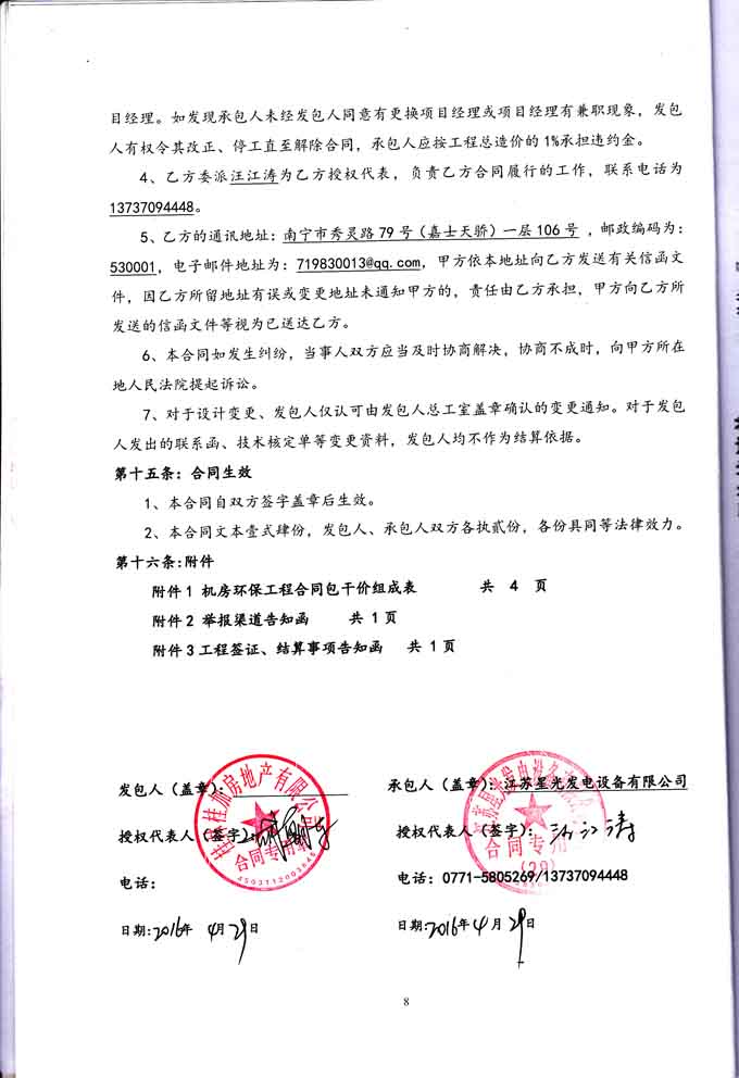 2016年4月29日,林桂加房地產(chǎn)有限公司與我公司簽訂了桂林恒大廣場8#、11#地塊商業(yè)地塊柴油發(fā)電機機房環(huán)保工程合同,我公司為其提供1000KW柴油發(fā)電機組和1200KW柴油發(fā)電機組的機房噪聲、廢氣綜合治理、環(huán)保工程及機房照明、排風(fēng)工程。合同如下: