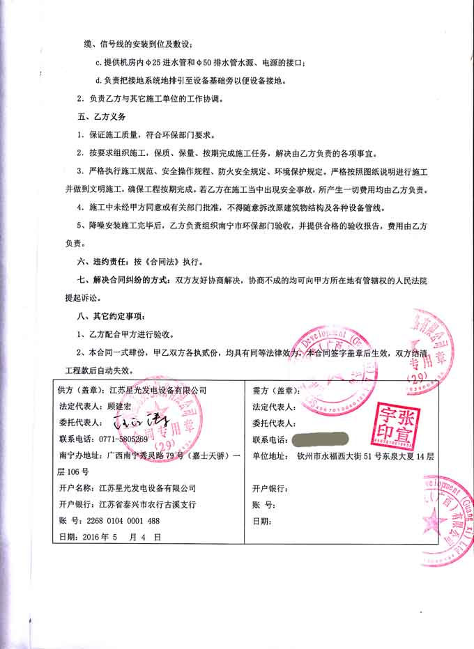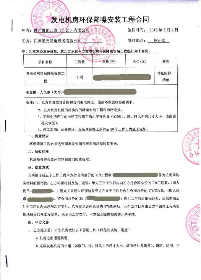 2016年5月4日,世洋置地開發(fā)(廣西)有限公司工程與我公司簽訂800KW柴油發(fā)電機(jī)組機(jī)房環(huán)保降噪安裝工程合同,我公司負(fù)責(zé)發(fā)電機(jī)組在的降噪工程安裝及油路連接,并保證環(huán)保降噪工程達(dá)到環(huán)保局的驗(yàn)收要求,合同如下: