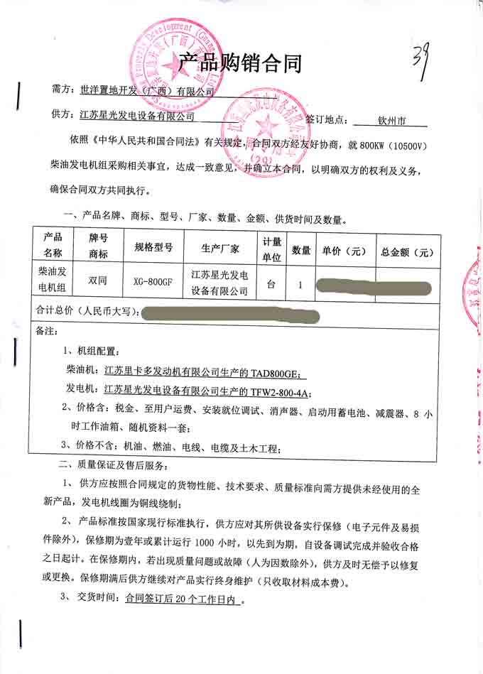 2016年5月4日,我公司成功與世洋置地開發(fā)(廣西)有限公司簽訂800KW柴油發(fā)電機組產(chǎn)品購銷合同,我公司為其提供配置為柴油機:江蘇里卡多發(fā)動機生產(chǎn)的TAD800GE;發(fā)電機:江蘇星光發(fā)電設(shè)備有限公司機生產(chǎn)的TFW2-800-4A的里卡多柴油發(fā)電機組一臺。發(fā)電機產(chǎn)品購銷合同如下: