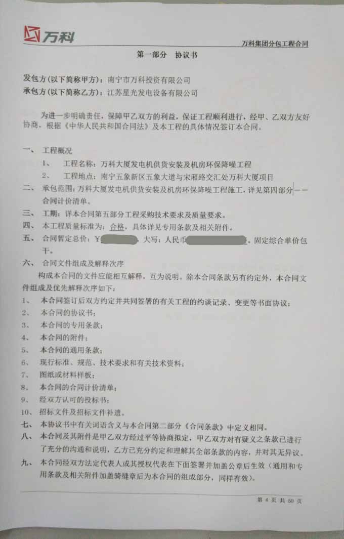 2016年4月9日,我公司憑借精湛的技術,良好的產品質量和完善的售后服務體系成功與南寧市萬科投資有限公司簽訂萬科大廈發(fā)電機供貨安裝及機房環(huán)保降噪工程合同,我公司為其提供630KW柴油發(fā)電機組(含減震裝置和消音器)兩臺,機組配置為發(fā)動機:重慶康明斯柴油機KTA38-G2,發(fā)電機:廣州英格發(fā)電機EG400-640N和鄭州眾智控制器。發(fā)電機產品購銷合同如下: