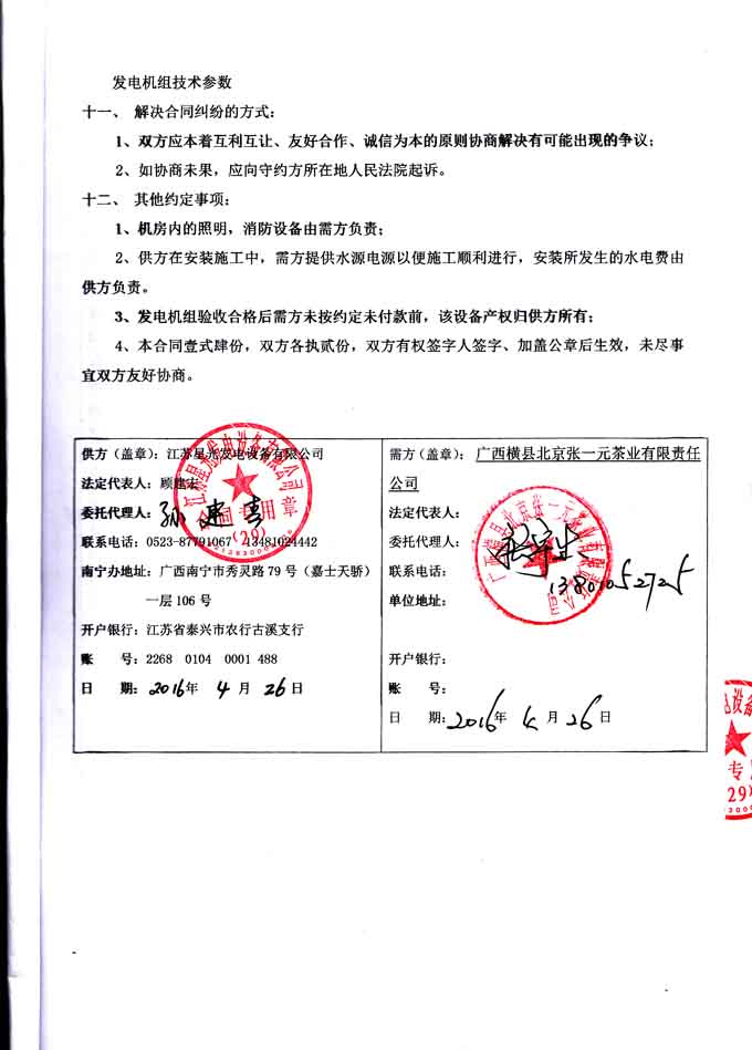 2016年4月26日,廣西橫縣北京張一元茶業(yè)有限責(zé)任公司與我公司簽訂柴油發(fā)電機(jī)組購銷合同,我公司為其提供兩臺(tái)700KW發(fā)電機(jī)組和發(fā)電機(jī)組自動(dòng)并機(jī)裝置一套,機(jī)組配置為上海柴油機(jī)股份有限公司配江蘇星光發(fā)電機(jī)(700KW柴油機(jī)型號(hào):SC33W1150D2,發(fā)電機(jī)型號(hào):TFfF2-700-4A)。發(fā)電機(jī)產(chǎn)品購銷合同如下: