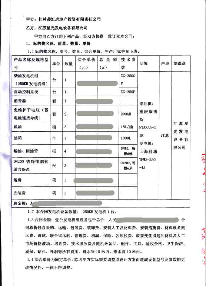 2016年4月15日,桂林襲匯房地產(chǎn)投資有限責(zé)任公司與我公司簽訂滟瀾山B組團(tuán)柴油發(fā)電機組采購安裝合同,我公司為其提供一臺250KW康明斯發(fā)電機組,機組為重慶康明斯柴油機配上海科浦發(fā)電機,配有消音器蓄電池等部件。發(fā)電機產(chǎn)品購銷合同如下: