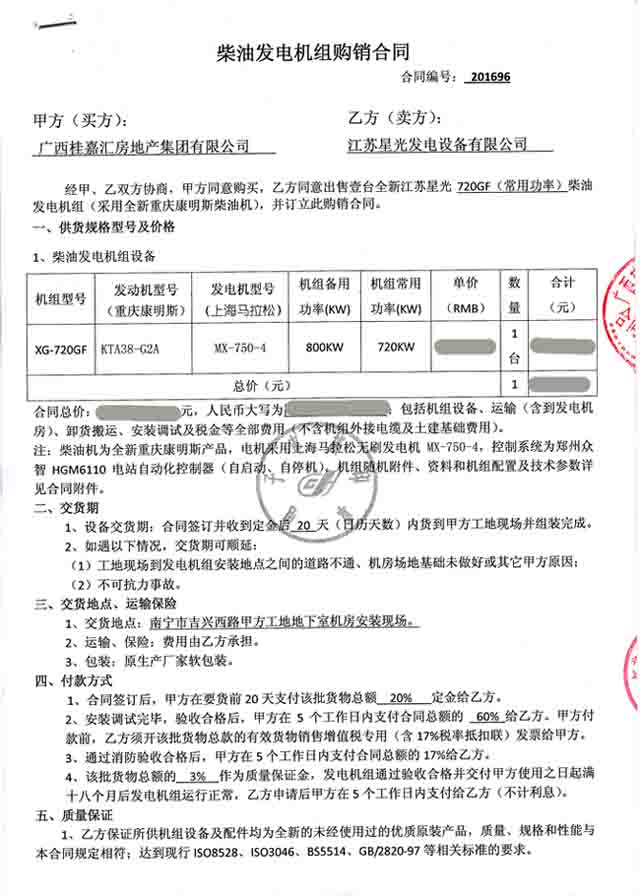 2016年4月20日,廣西桂嘉匯房地產(chǎn)集團(tuán)有限公司與我公司簽訂800KW柴油發(fā)電機(jī)組采購合同,我公司為其提供一臺配置為康明斯發(fā)動機(jī)配上海馬拉松發(fā)電機(jī)合鄭州眾智控制器的發(fā)電機(jī)組,發(fā)電機(jī)產(chǎn)品購銷合同如下: