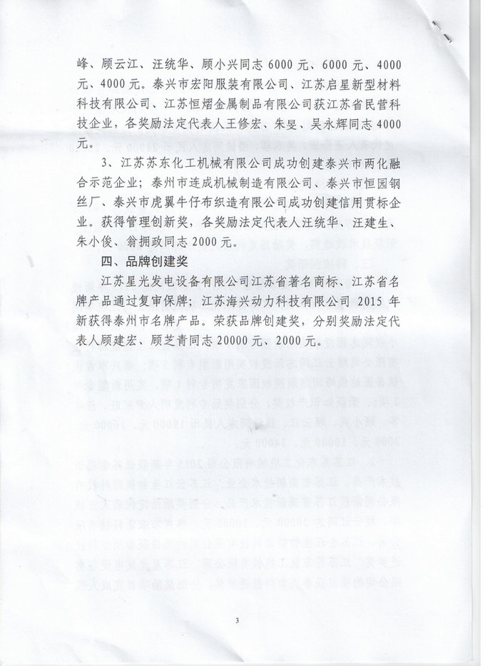 我公司在2016年3月21日的泰興市古溪鎮(zhèn)人民政府文件《關(guān)于表彰2015年度企業(yè)發(fā)展先進(jìn)單位和先進(jìn)個(gè)人的決定》中獲得以下表彰: