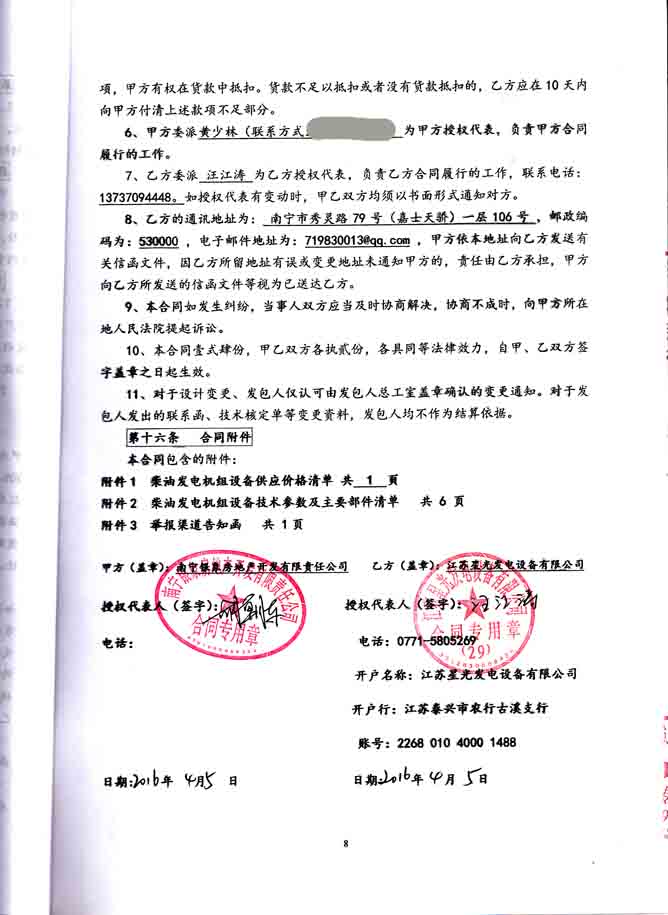 2016年4月5日,南寧銀象房地產(chǎn)開發(fā)有限責(zé)任公司與我公司簽訂南寧恒大綠洲首期、二期8#、23#、37#樓地下室柴油發(fā)電機(jī)組設(shè)備采購及安裝合同,我公司為其提供配置為英國珀金斯發(fā)動(dòng)機(jī)、陽江英格發(fā)電機(jī)深??刂破鞯?00KW發(fā)電機(jī)組、640KW發(fā)電機(jī)組、800KW發(fā)電機(jī)組各一臺,機(jī)組配有高效消音器、波紋減震器及蓄電池等附件。發(fā)電機(jī)產(chǎn)品購銷合同如下: